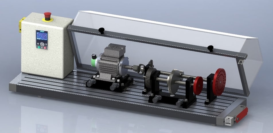 Le plan de travail à rainures sur lequel sont fixés le moteur et les accessoires. 3 tailles de bancs sont proposées suivant les défauts à étudier. Ils disposent d’un tableau de commande pour gérer la vitesse du moteur et la charge si elle est installée. Verrouillage du capot par une gâche électrique de sécurité.